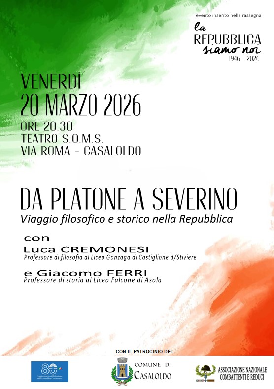 "Da Platone a Severino – Viaggio filosofico e storico nella Repubblica”, che si terrà venerdì 20 marzo 2026 alle ore 20.30 al Teatro S.O.M.S. di Casaloldo (via Roma).